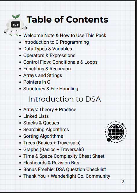 You’ll get: ✅ 50+ page PDF Masterpack ✅ C Programming + DSA modules ✅ Clean code snippets for each concept ✅ Practice Questions + Mini Challenges ✅ Time & Space Complexity Cheatsheet ✅ GitHub repo access with all working code 🎴 Flashcards bundle (Coming Soon – Free for early buyers)
